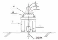 ③調整ナットをセンターシャフトにねじ込み、軽く試験機に接触させて脚の長さを調整する。